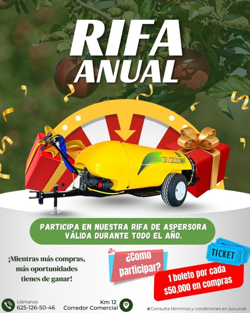 Durante todo el año 2026 estaremos rifando una aspersora frutícola de 2000 litros.